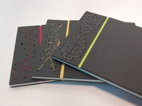 3. Šití: Máte např. 7 dírek. Hřbet knihy otočte směrem k sobě. Zleva doprava počítejte 1., 2., 3., 4. – 7. dírka. Nit s jehlou provlékněte 6. dírkou, pak opět 6. dírkou. Uděláte tak smyčku kolem hřbetu a jdete k 5. dírce, provléknete a ještě jednou opět 5. dírkou; tentokrát uděláte smyčku kolem hřbetu. Pokračujte spodem hřbetu k 4. dírce, provléknete a stejným způsobem jdete až k 1. dírce. Tam opět vytváříte kolmou smyčku ke hřbetu a vracíte se na 2. a 3. až 7. dírku. Od kraje se vrátíte zpět do 6. dírky a na zadní straně zakončíte uzlem.
